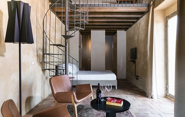 Alcune camere affacciano su una tranquilla corte interna, dove un vecchio ulivo svetta al centro come un silenzioso guardiano. Altre invece si sviluppano su due livelli grazie ai soffitti alti 5 metri e si aprono su una grande terrazza.