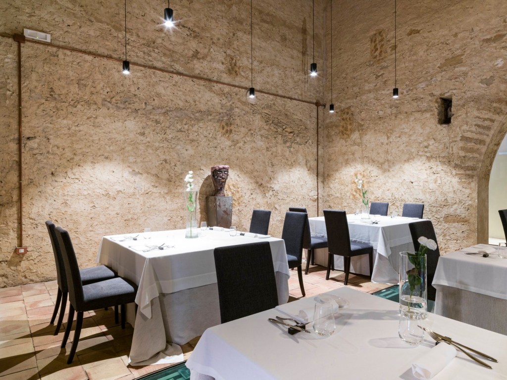 Uno degli ambienti più scenografici a Feudi del Pisciotto è il ristorante, con le sue sale spaziose rivestite in pietra dai soffitti molto alti e ritagli di pavimento in cristallo che lasciano intravedere la moderna cantina sottostante. È qui che vengono organizzate le degustazioni di eccellenti vini internazionali e locali, tra cui è previsto un assaggio del famoso Nero d’Avola 2015 annoverato tra i migliori 100 vini nella rivista americana Wine Spectator.