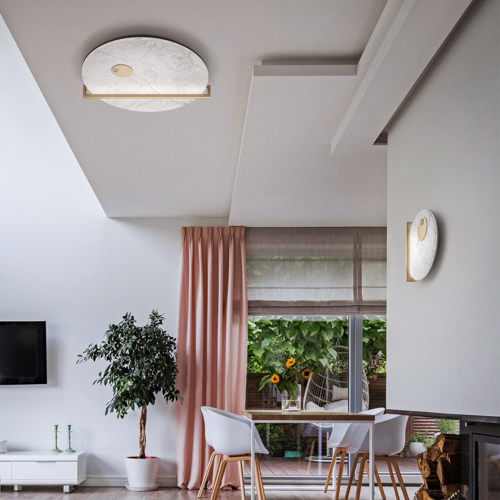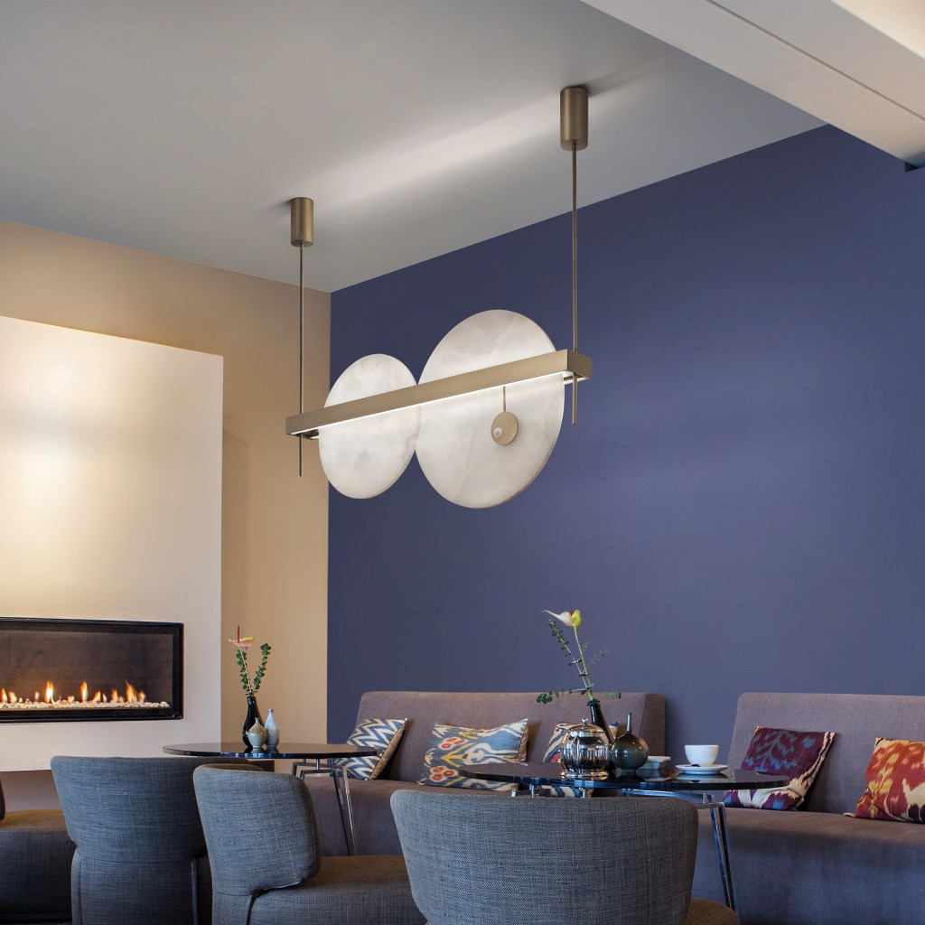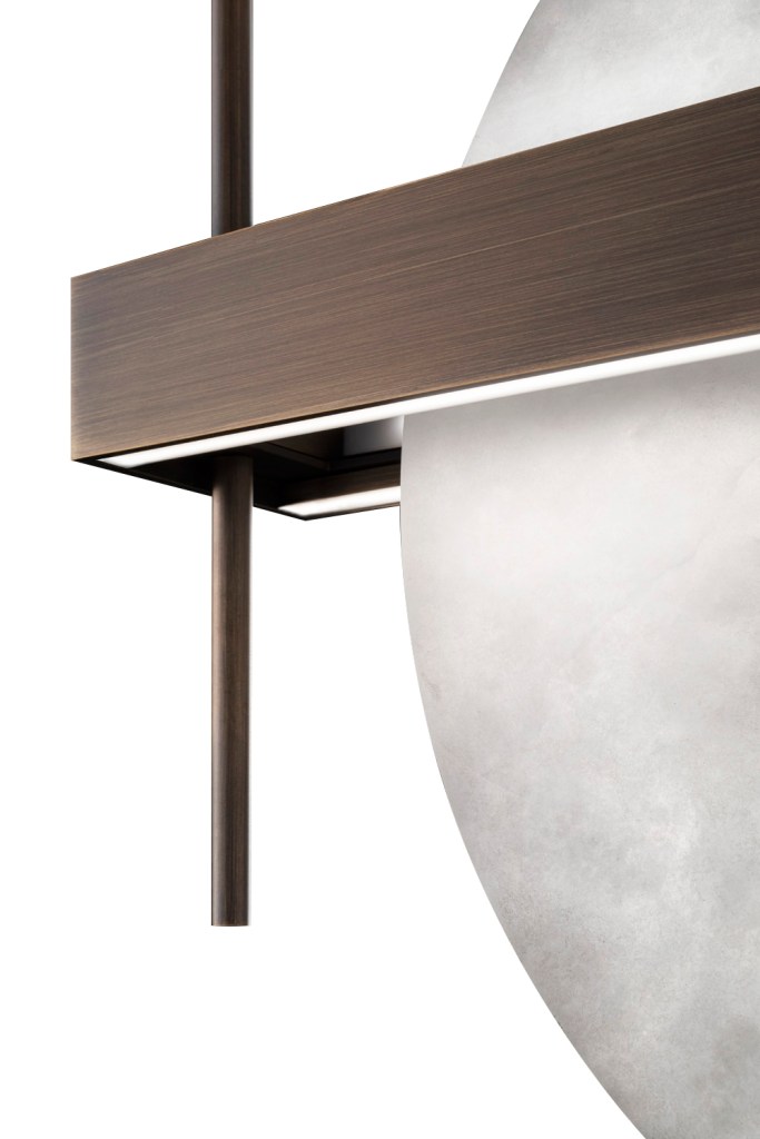 Il primo fattore che rende la collezione Luna Nuova elegante e moderna è senza dubbio la scelta di forme semplici combinate a materiali preziosi. Nel caso del lampadario, ad esempio, l’aver abbinato due dischi in alabastro di misure differenti con una fascia in metallo brunito rende la composizione molto bilanciata e allo stesso tempo d’impatto, per un ambiente moderno che abbia bisogno di un certo effetto scenografico, come una zona living o pranzo, senza rinunciare alla raffinatezza.
