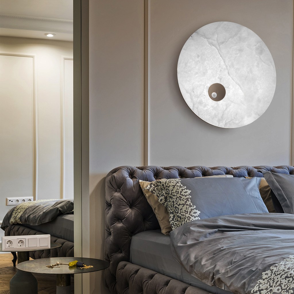 Un altro aspetto importante che rende elegantissima questa collezione è il ruolo della tecnologia LED. In molti prodotti della collezione è infatti possibile apprezzare la doppia illuminazione bifacciale, una scelta sì tecnica ma con uno scopo poetico. Se l’alabastro infatti ricorda la superficie della luna nella sua matericità, è solo unendolo alla tecnologia LED che acquisisce quell’aura “lunare” tutta da contemplare.