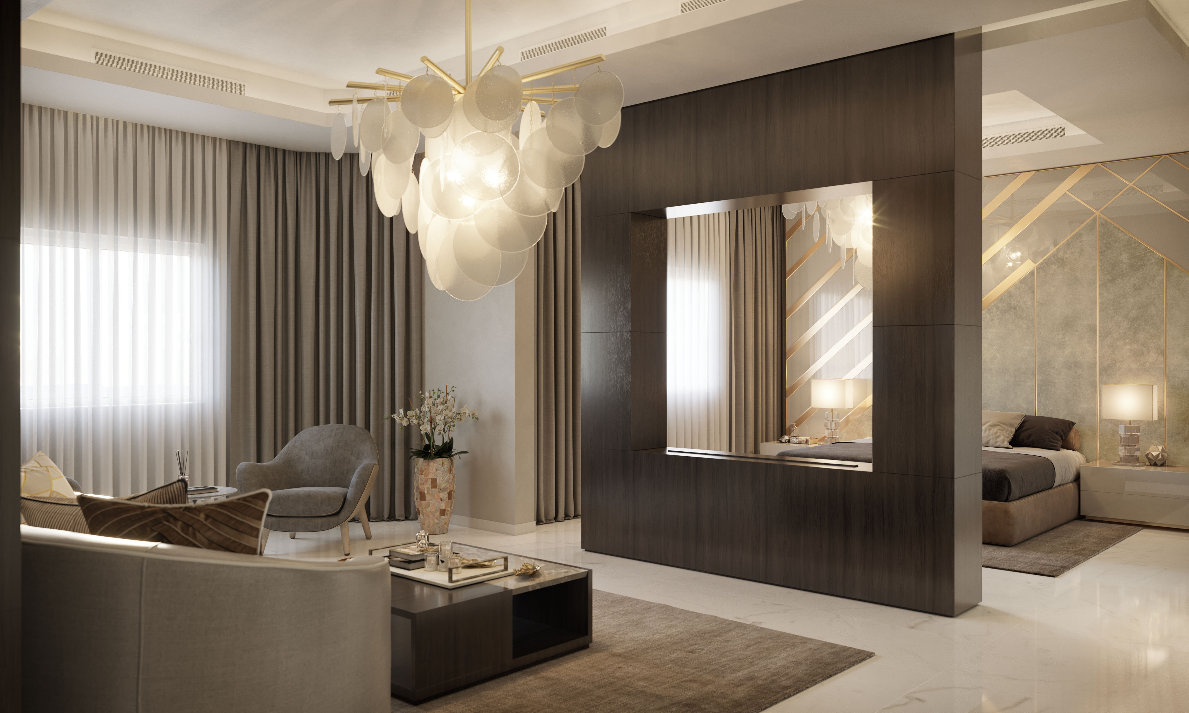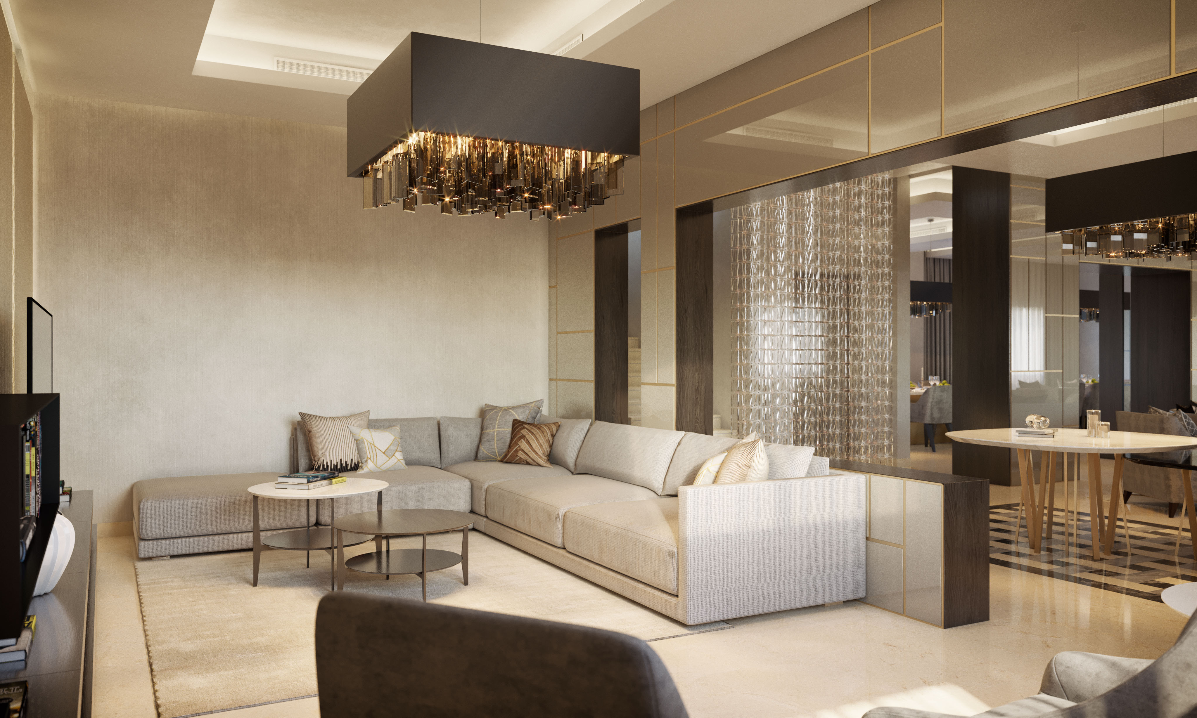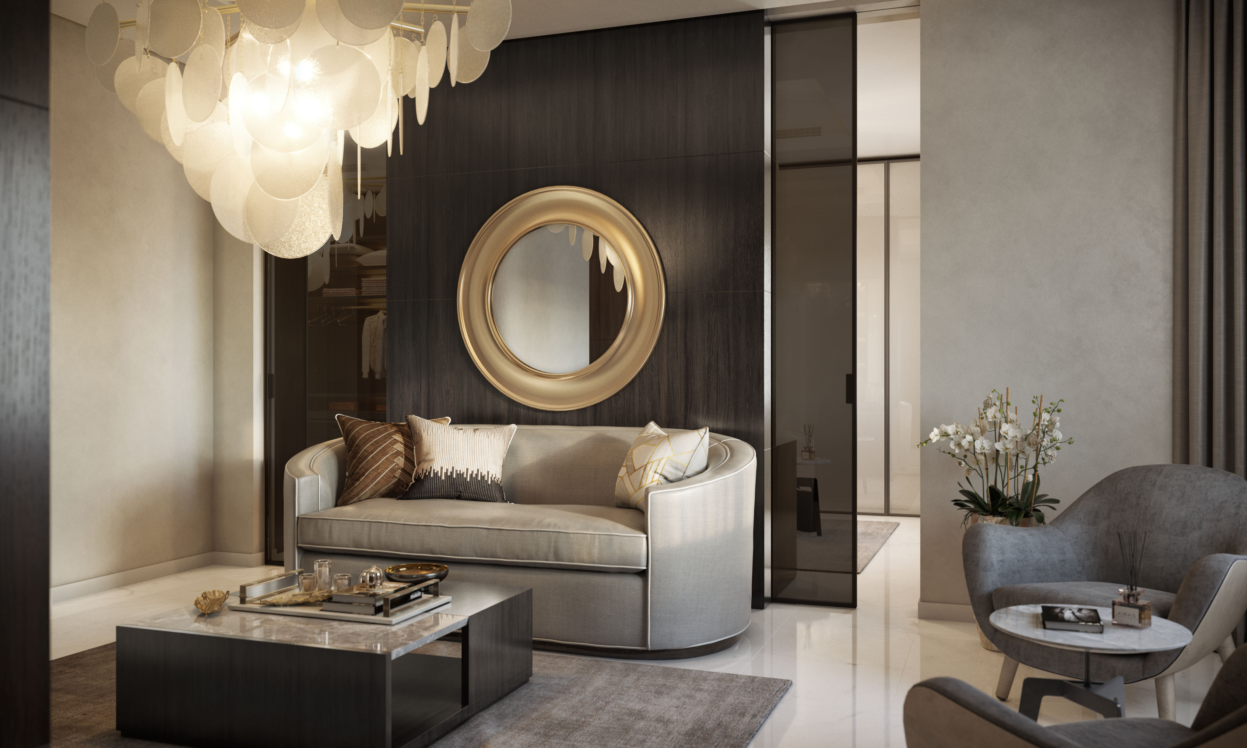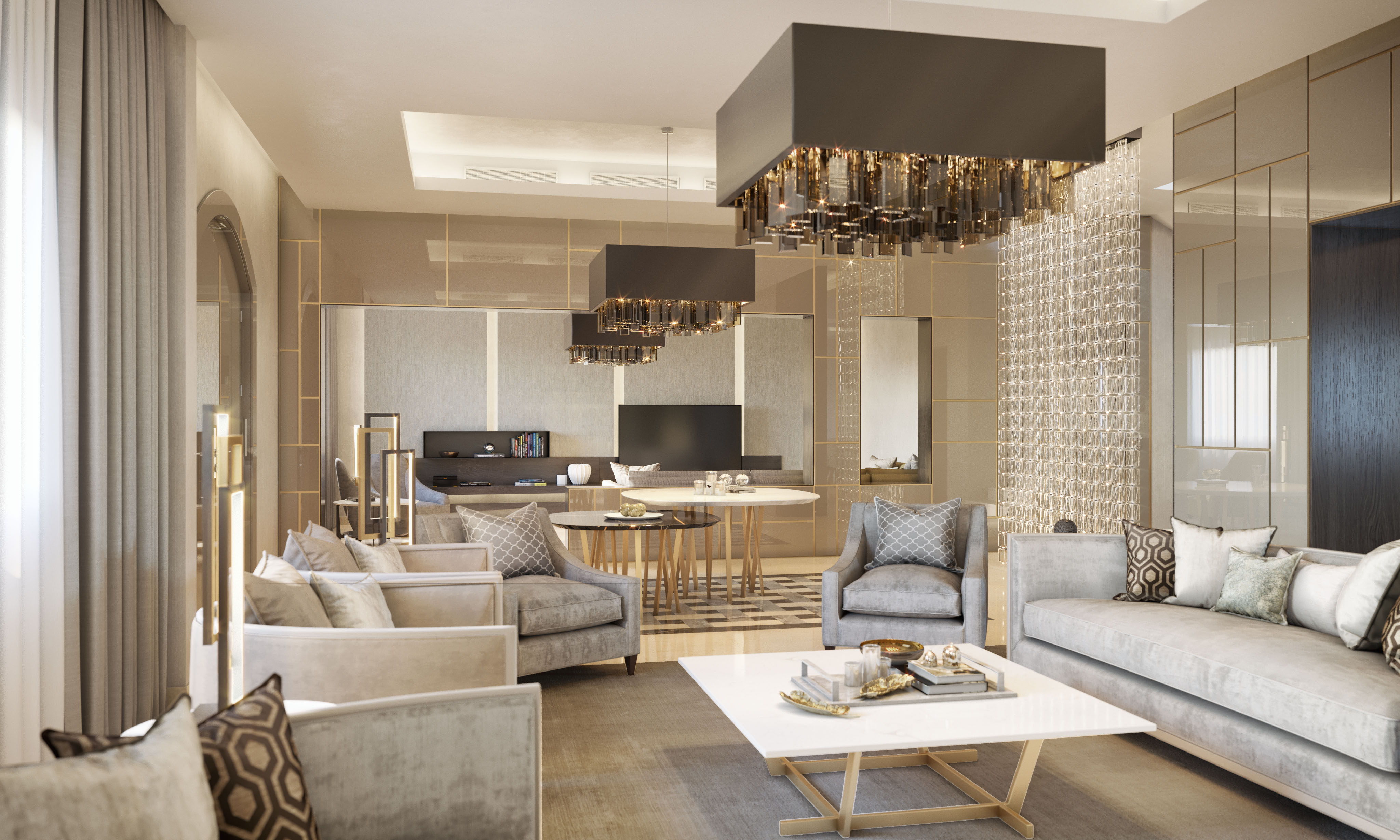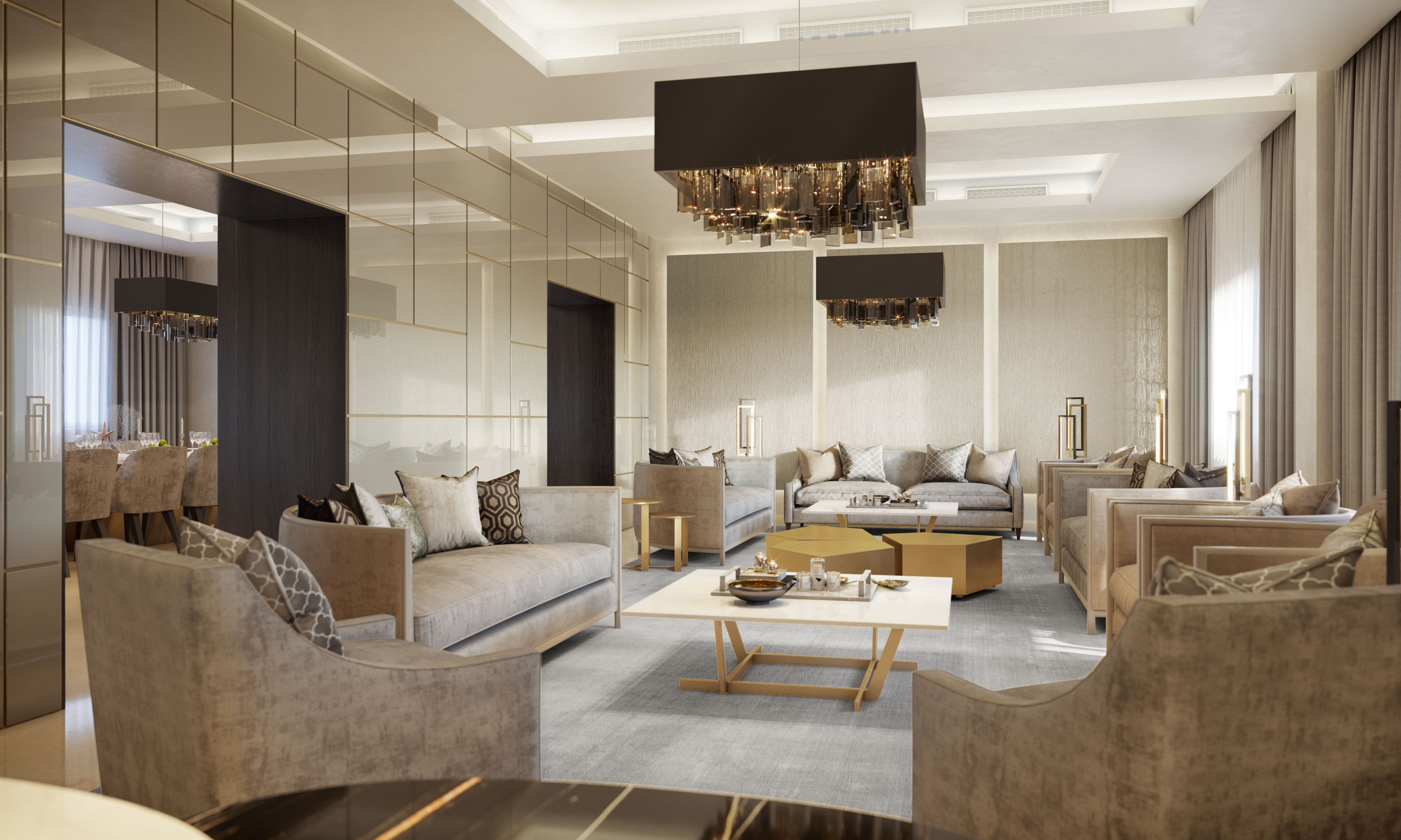 Tra i render, infatti, è possibile riconoscere il majilis, il salotto di rappresentanza tipico della cultura araba, che è organizzato in modo tale da avere più sedute differenti. Per la cliente abbiamo selezionato eleganti divanetti curvi a due posti e delle poltrone strutturate, completano la proposta dei tavoli bassi al centro e dei tavolini più alti ai lati per le lampade da tavolo.